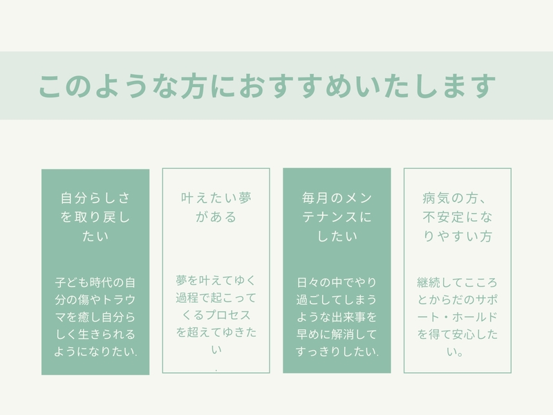 本来の自分を取り戻したい/自分やりたいこと・夢を叶えたい/自分を変えたい/毎月のメンテナンスにしたい