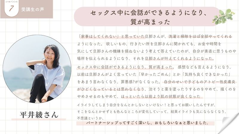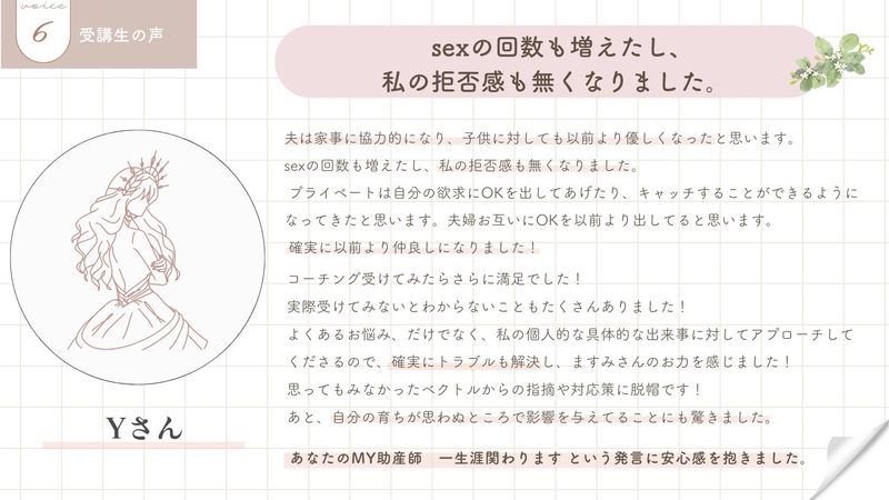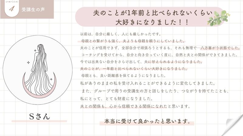 お母さんの一生涯を見て、ノウハウやスキルよりももっと大切な本質の部分を徹底サポートしています。