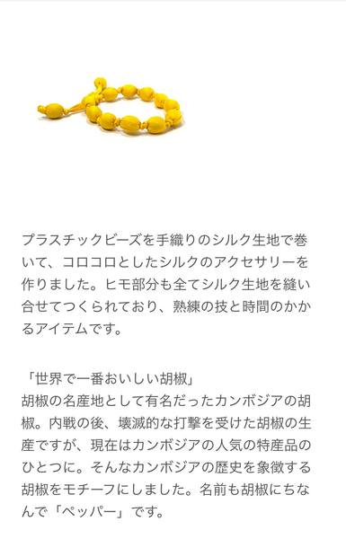 | 素材 | 手織りシルク、プラスチックビーズ(中)、金具(メッキ加工) |