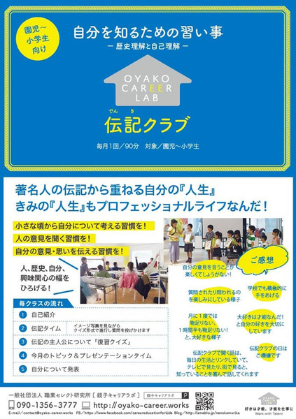 \今回初めての一般募集!/ 業務拡大のため、親子キャリアラボの人気クラスである「伝記クラブ」の講師を一般募集することになりました! ●伝記クラブに興味がある方 ●我が子を通わせているけれど、講師をやってみたい方 ●いつかは教育業界に関わってみたい方 ●子どもの才能発見をサポートしてみたい方 ●キャリア教育、進路選択に関心がある方