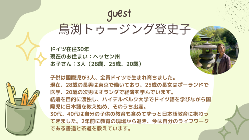 しかもチエコさんはベルリン、フランクフルトの補習校での教職経験があり、トシコさんはハイデルベルク補習校で校長をされていた経験をお持ちです。