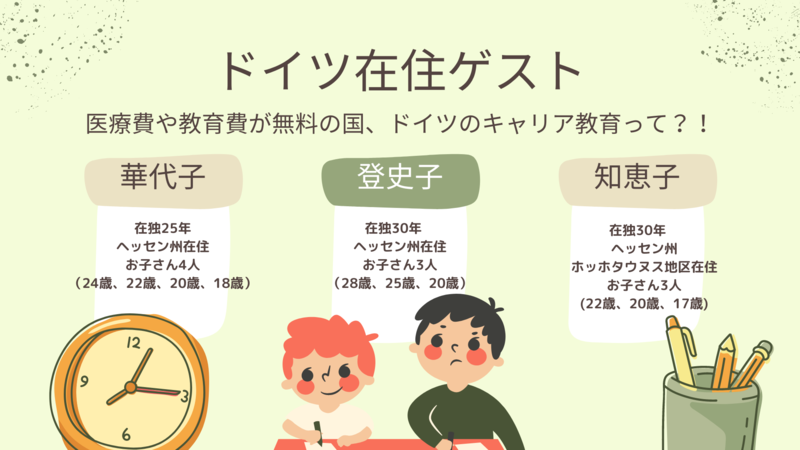 今回は、ドイツ編ということで、ドイツで子育てをされている3人の日本人女性をゲストにお迎えして、ドイツのキャリア教育についてお話をうかがいます。