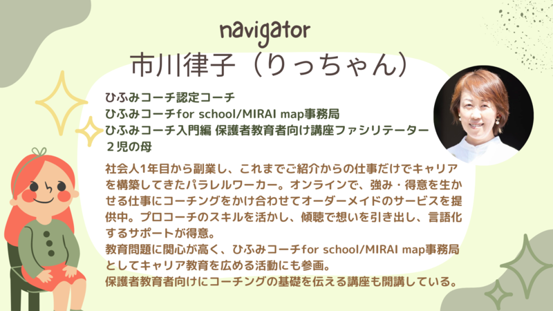 毎回各国からゲストを招きその国のキャリア教育について学んでいきます。ゲスト全てがキャリアの専門家ではありませんが、自分の子や身近な人を通しての実際の話が聞ける貴重な機会です。参加者同士の対話を含め知ること、考えることで、自身のキャリアと向き合いながら、深めていくことをしたいと思います。発想が広がり、様々な視点を持った保護者や教員、キャリアを相談できる人がいて、取り巻く人々からの応援があれば、子どもは(大人も)もっと伸びやかに仕事や環境を選び、生き方を選べる!