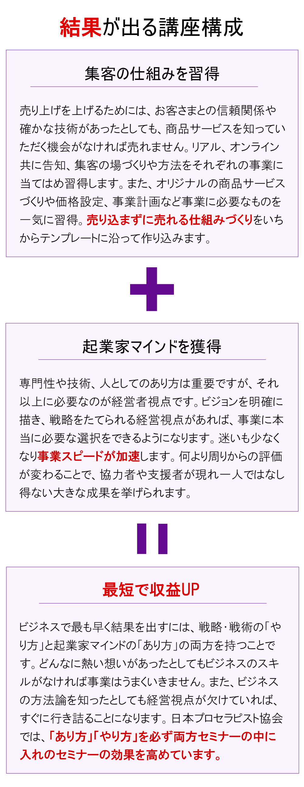 しかし、スタッフ教育に悩んだ私が受講した【日本プロセラピスト協会】のオープンセミナーで衝撃だったのが、私が10年かけて実践で学んだ事がたったの2日で学べるという事でした!自分が考えるやり方だけの10年は失敗だらけでしたし、そこには時間もお金も費やしました。もっと早く、この講座を受けていればこんなに遠回りはしなかったのに!そう思いました。だからこそ、この講座にたどり着いた方にはぜひ受講してほしい!