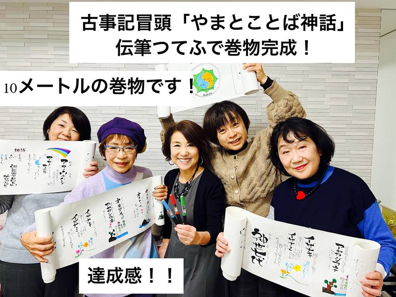 古事記冒頭文が書かれた「絵本 やまとことば神話 古事記の神々」の伝筆手本を真似て、筆ペンで10メートルもの巻物に制作します。