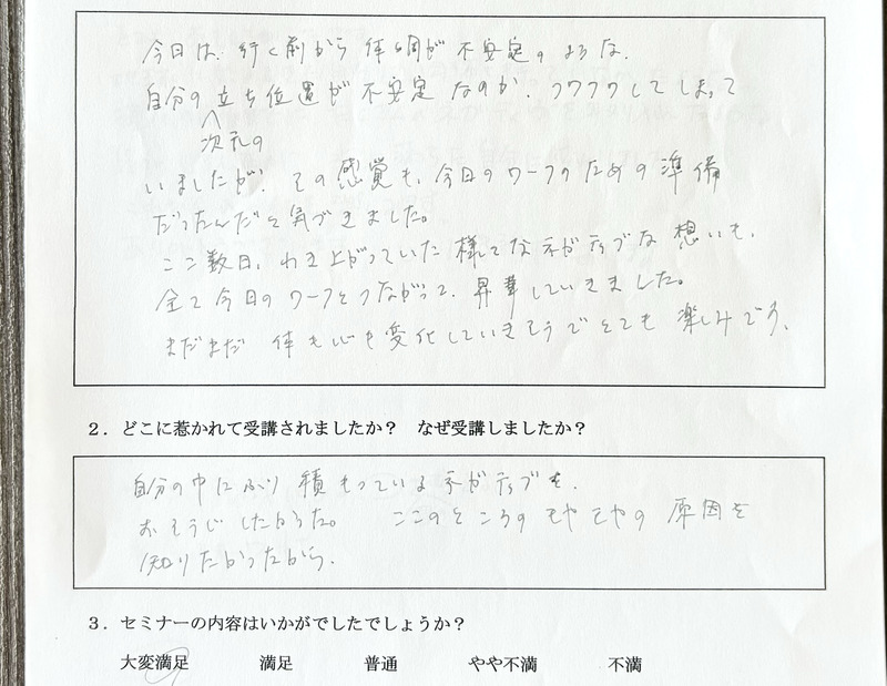 ●よく受け入れると書かれていますが、具体的にどういうことかよくわかりませんでした。光一さんのお話で、スルーすると気にしなくなると言うようなことだと理解できました。自分の過去性が気になって、囚われがありましたが、今回のワークで書き変わったしあまり気にならなくなったように思います。新しい自分として行動していってみたいと思います。何が起こるか楽しみです。