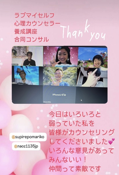 ラブマイセルフカウンセラー養成講座となりたい自分になる!自己肯定感&魅力アップセッション受講中と卒業生の方を対象に月2回グループコンサルを開催しています。