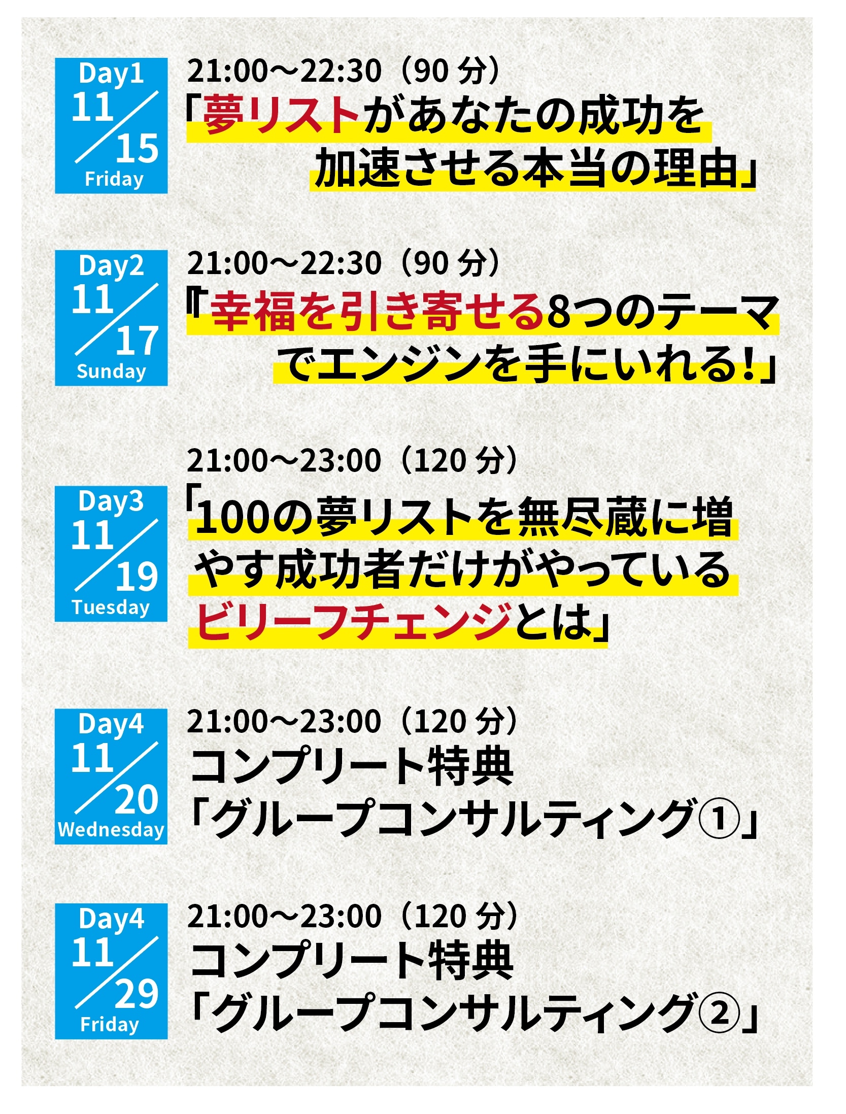 受付は2024年11月14日(木)23:59で終了しました。 このような方におすすめ 人生を豊かにする夢リストを作成したい方・行動力を加速させるエンジンが手に入れたい方・「やり切る力(GRIT)」が身に付けたい方 期待できる効果 100の夢リストを作ることができます お申込みいただきますとご案内が自動配信メールにて配信されます。万が一、お申込み後5分が経ってもメールが届かない場合は、迷惑フォルダまたは受信フォルダ以外のフォルダに届いている可能性がございますのでご確認ください。特に、携帯キャリアメールアドレス宛にはメールがお届けしづらくなっております。メールが届かない方は、下記までお問い合わせください。<お問い合わせ先>夢スク 事務局youmeschool.100@gmail.com 自己肯定感アニキ 津田 紘彰 『それでも、生きてきてよかった』と思える人生を応援します。 ファン・マーケティングの専門家 田中克成 「与えて与えてみんなで勝つ!」 開催要項 開催日時 2024年11月15日(金) 開始 21:00 終了 23:00 場所 Zoom Zoom 参加費 無料 定員 100 名 【残 26 席】 申込受付期間 2024/11/ 8(金) 11:05 ~ 2024/11/14(木) 23:59まで 主催者 未来創聖株式会社 お問い合わせ先 未来創聖株式会社 お問い合わせ先電話番号 お問い合わせ先メールアドレス youmeschool.100@gmail.com