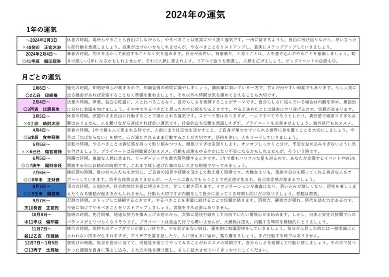 受けた直後は、1年の運気や月毎の運気、日毎の運気も細かく書かれた表が貰えるので計画を立てるのにとても役に立ちそうだと思いました。