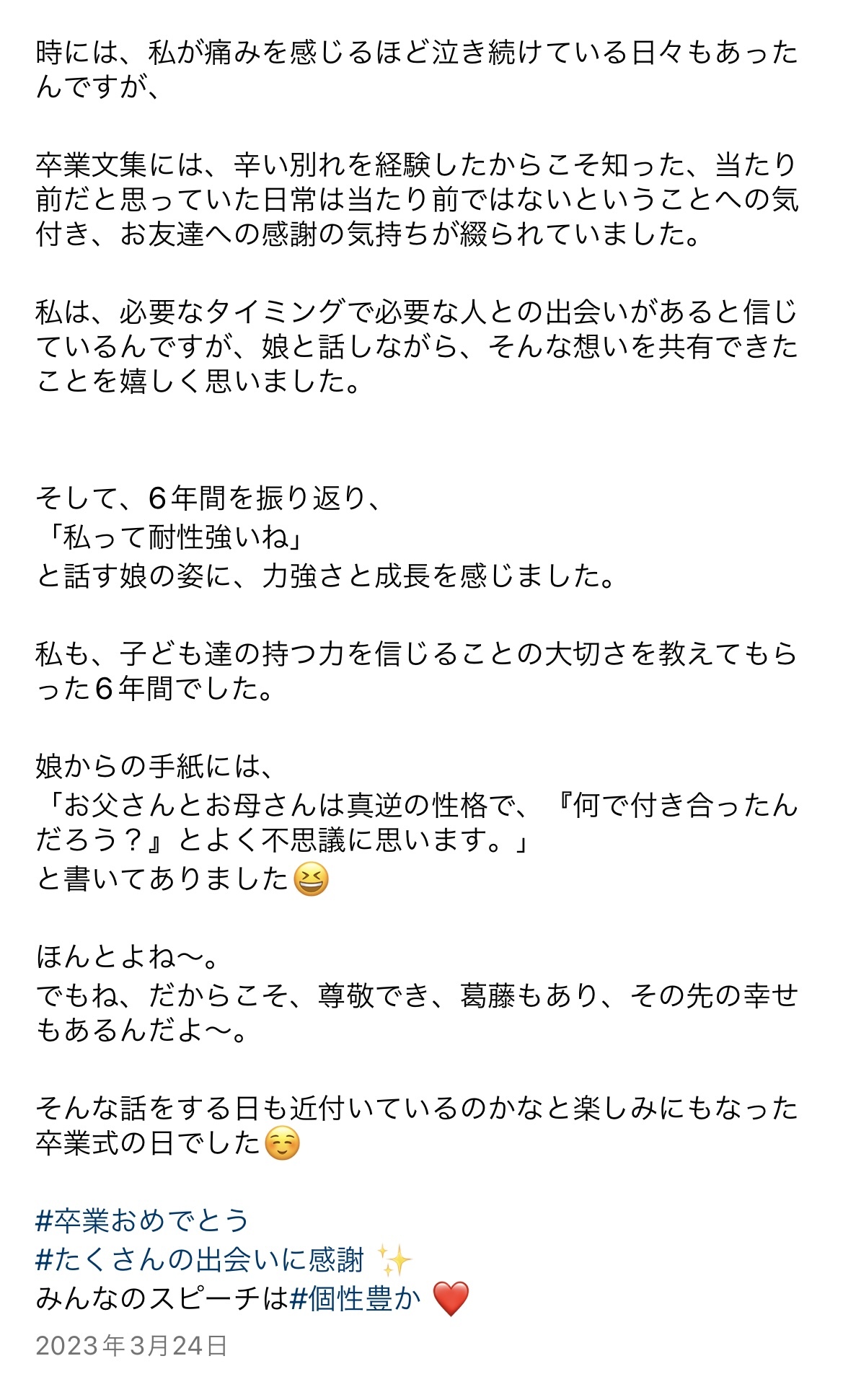 結局、その後もわが家は転々とし、娘は4つの小学校にお世話になりましたが、卒業時、力強い言葉を残しています。