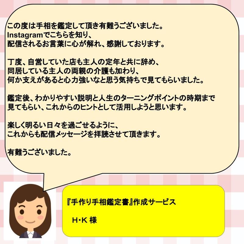 手相鑑定有難うございました。60歳を過ぎてますので…迷いましたが観ていただいて良かったです。肉眼では分からない線も沢山あり驚きました。30歳半ばからの看護職、60歳目前で先祖の墓を守る為に伯父の家を継いだ事、いまだに資格を取ろうとあくせくしている事、定年過ぎても仕事を辞める気が全くしない事等が手相に現れていました。大器晩成とか…これからの人生が楽しみで仕方ありません。有難うございました。小林 優子 様