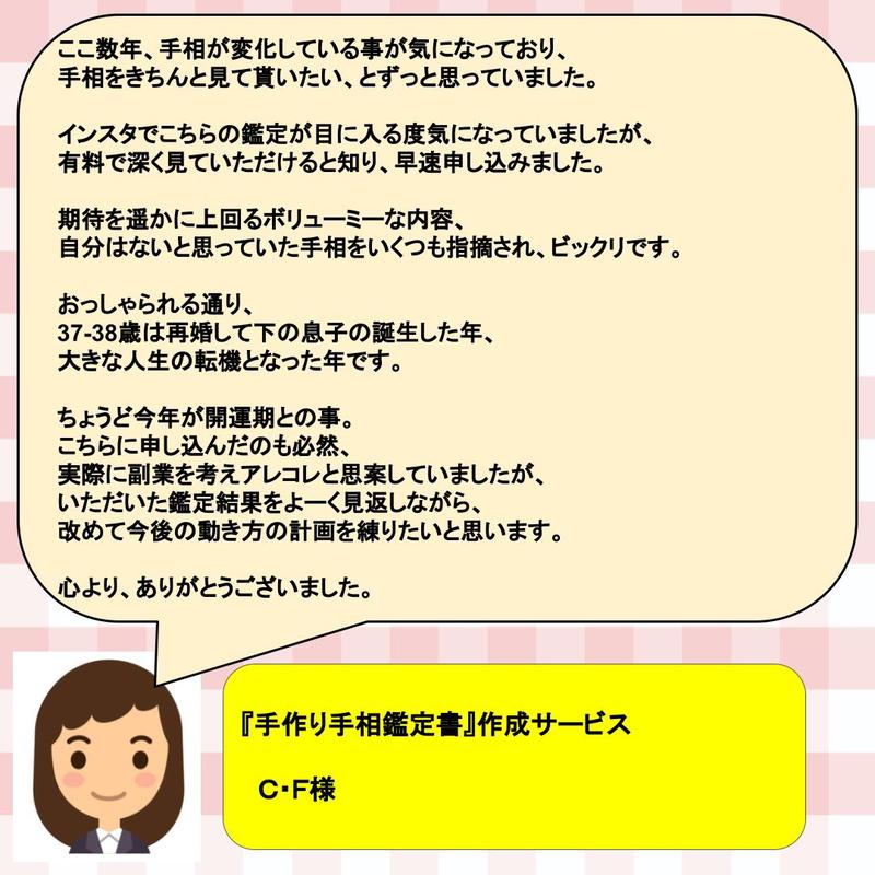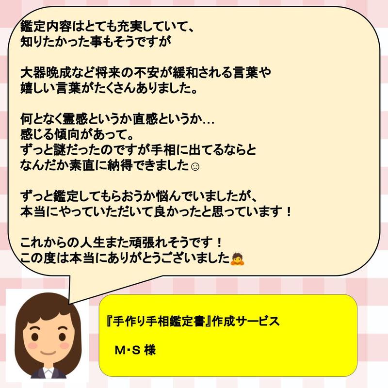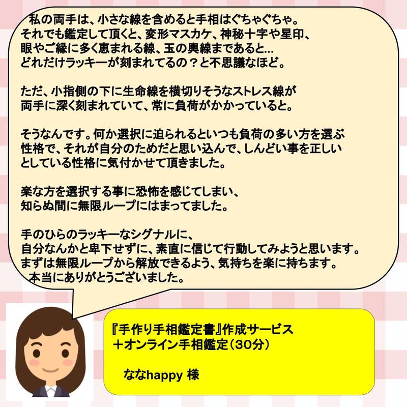 自分では、気付けない事を手相鑑定で色々知れて良かったです。凄く良いタイミングでお願い出来て良かったです。