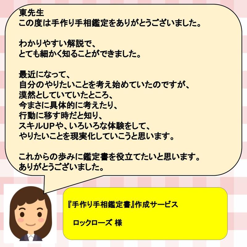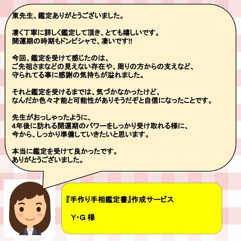 両手の仏眼相や神秘十字、起業線など人に指摘されてから手相が気になりはじめて、独学で学んで来たりしましたが、今回の鑑定書でより沢山の自分の事を知り、私の人生がそのまま記されている様な鑑定書に更に手相を学びたくなるような気持ちになりました。ありがとうございました。ううな 様