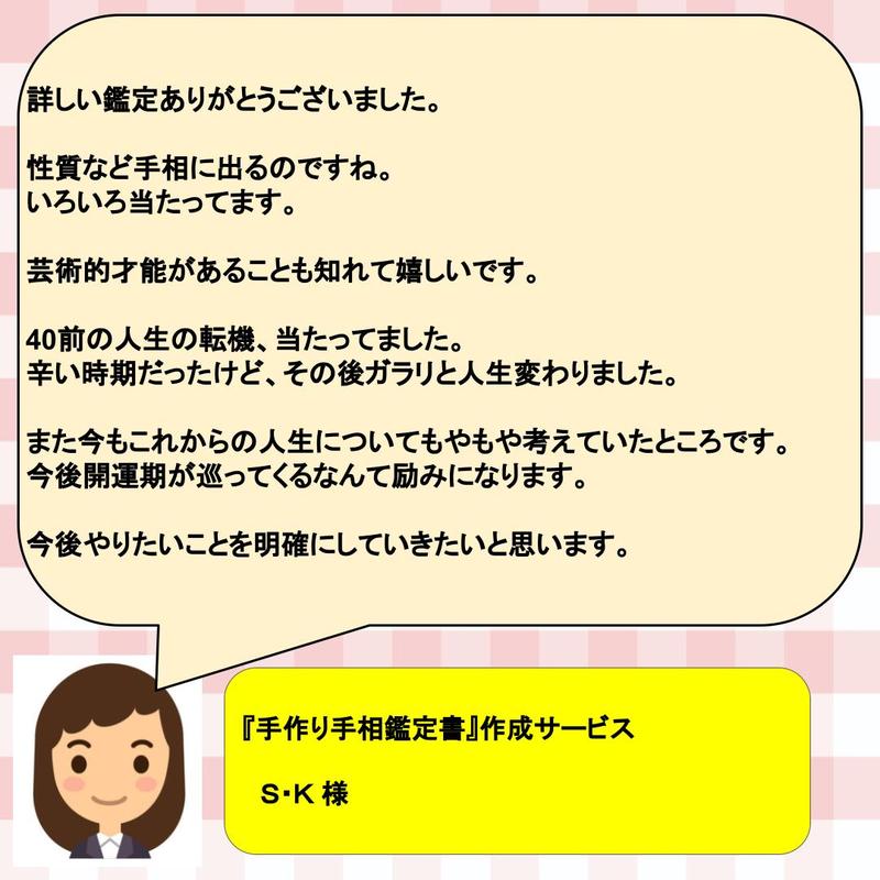 今回はとても詳しく手相を見て頂き本当にありがとうございました。自分の性格や転換期の年齢を教えてもらいとても良かったです。
