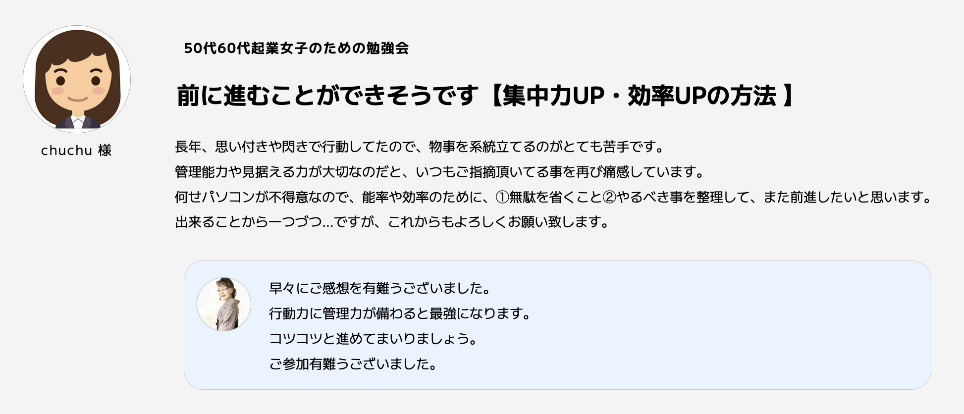 今日参加したことをきっかけに参加終了後、自分会議の時間を持ちました。他の方の話も参考になりかつ、刺激になりました。ありがとうございました。機会があればまた参加したいです。chuchu 様